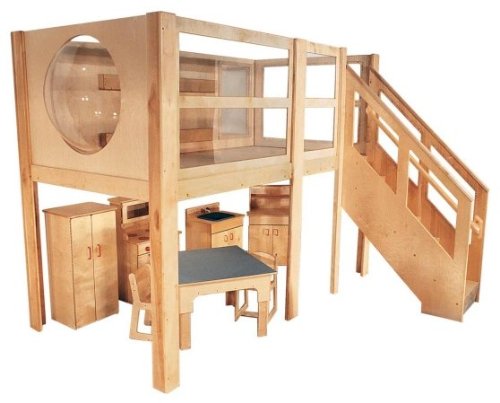 Preferred Strictly for Kids Mainstream Preschool Explorer 5 Expanded Size Loft with steps on the Right. Includes a mirror, book display & bubble panel above to create a quiet reading space, open below for dramatic play or other activities. Super industrial strength construction of solid maple, Baltic Birch plywood, clear unbreakable Lexan windows and fully carpeted. 120''w x 60''d x 52''h deck, 130''w x 109''d x 94''h overall, Beige MagiCarpet (carpet not shown). Assembles easily within approximately 60-90 minutes. Lifetime Warranty.